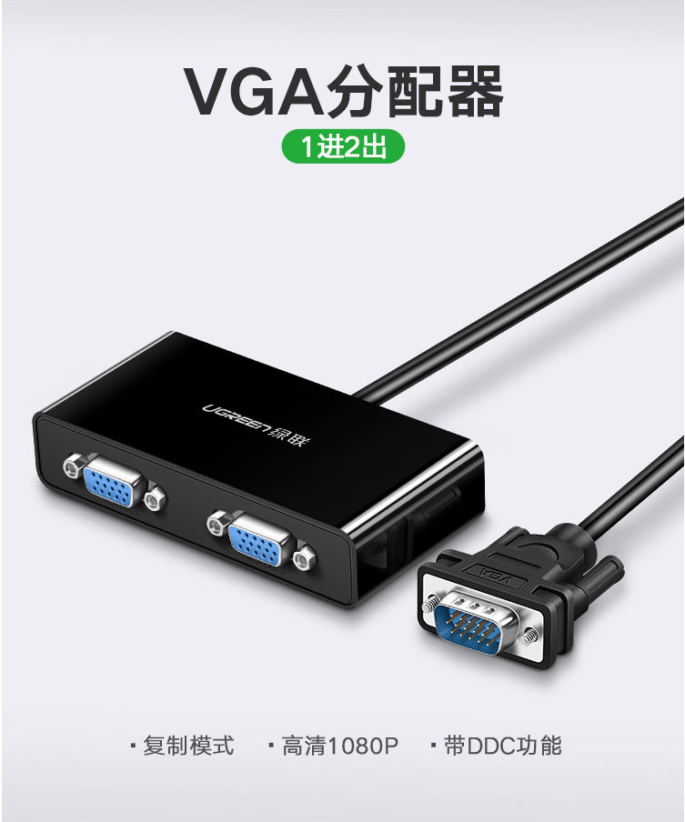 绿联(UGREEN)VGA分配器一分二 笔记本电脑显示器分屏器 高清视频转换器一进二出同屏器 1分2分频器