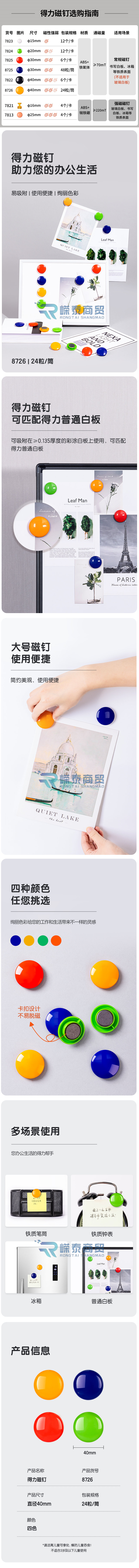 得力8726 磁钉Ф40mm(混)(24粒/筒)
